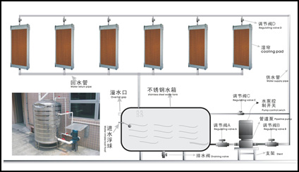 1、“濕簾-負(fù)壓風(fēng)機(jī)”降溫系統(tǒng)是由紙質(zhì)多孔濕簾、水循環(huán)系統(tǒng)、風(fēng)扇組成。未飽和的空氣流經(jīng)多孔、濕潤(rùn)的濕簾表面時(shí),大量水分蒸發(fā),空氣中由溫度體現(xiàn)的顯熱轉(zhuǎn)化為蒸發(fā)潛熱,從而降低空氣自身的溫度。風(fēng)扇抽風(fēng)時(shí)將經(jīng)過濕簾降溫的冷空氣源源不斷的引入室內(nèi),從而達(dá)到降溫效果。