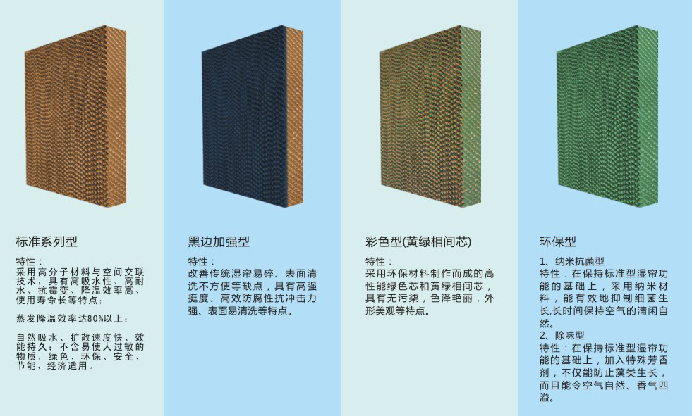 綠色濕簾型號(hào):5060/5090/7060/7090 優(yōu)質(zhì)濕簾還不含易使皮膚過敏的苯酚等化學(xué)物質(zhì),安裝使用時(shí)對(duì)人體無毒無害,綠色、安全、節(jié)能、環(huán)保、經(jīng)濟(jì)。